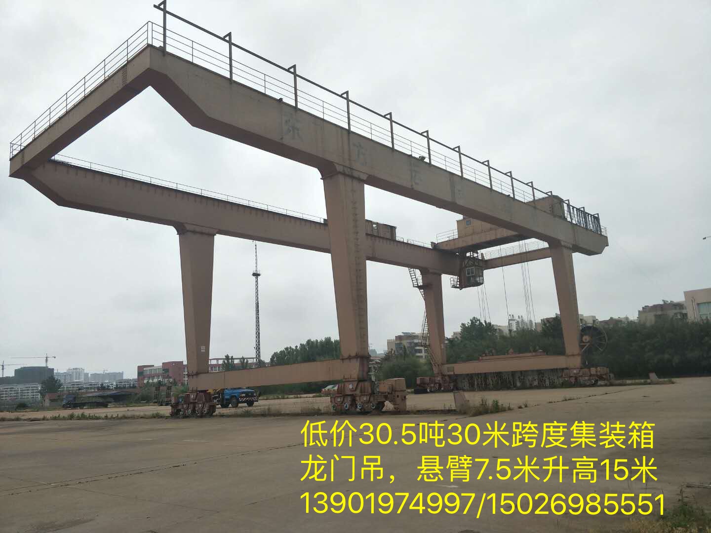 特价30.5吨30米跨度外悬各7.5米高度15米集装箱龙门吊,带吊具一套,安装少用,欢迎光临选购。